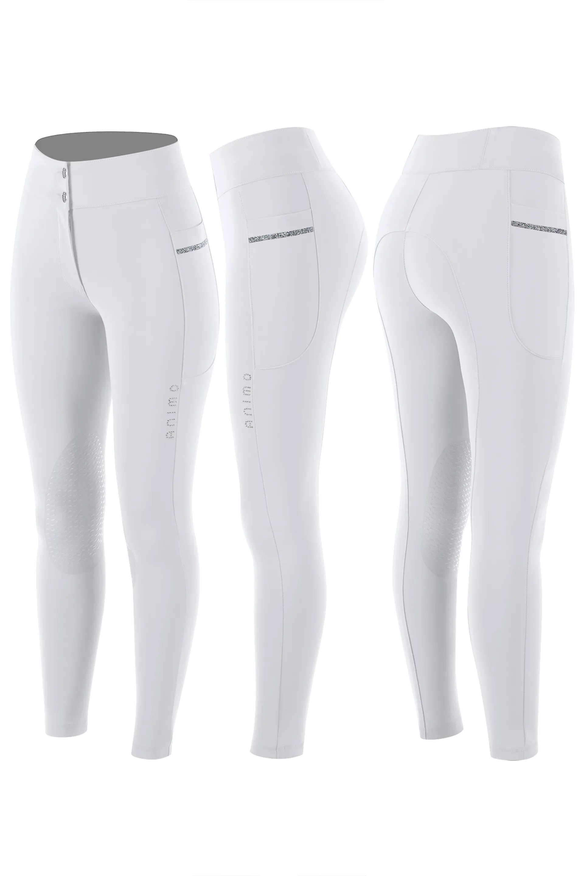 Exceptional breeches made of technical fabric that adapts to the rider's movements, but provides full freedom while riding. The fabric is breathable and quick-drying, which makes the breeches truly comfortable. The silicone grip improves the adhesion to the saddle, and the elastic inserts prevent the legs from sliding while riding. The high rise shapes the rider's silhouette. There is a large pocket on the leg, richly decorated with glittering crystals.