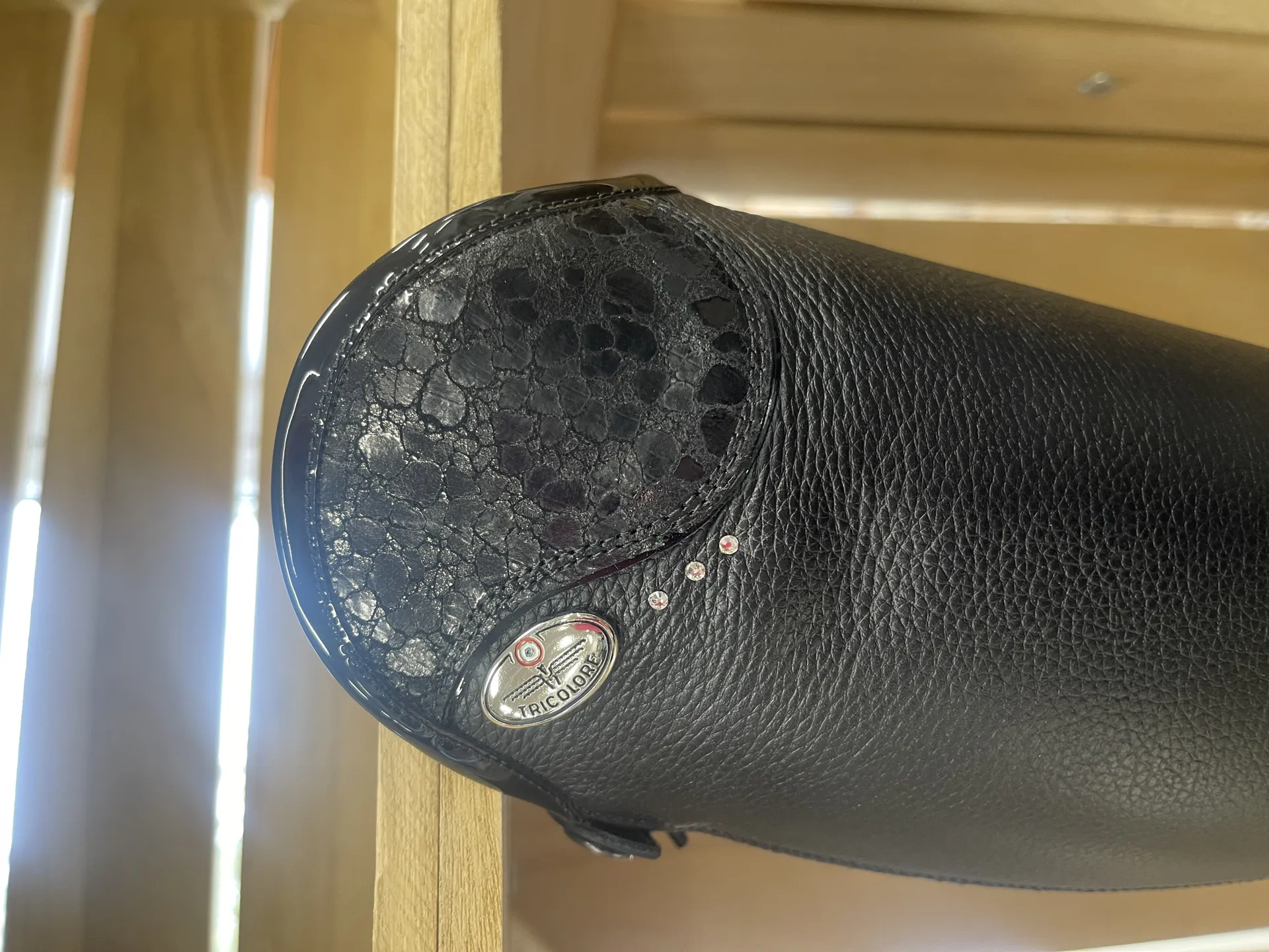 • Inlaid ware patch in smooth leather stitched in the leg