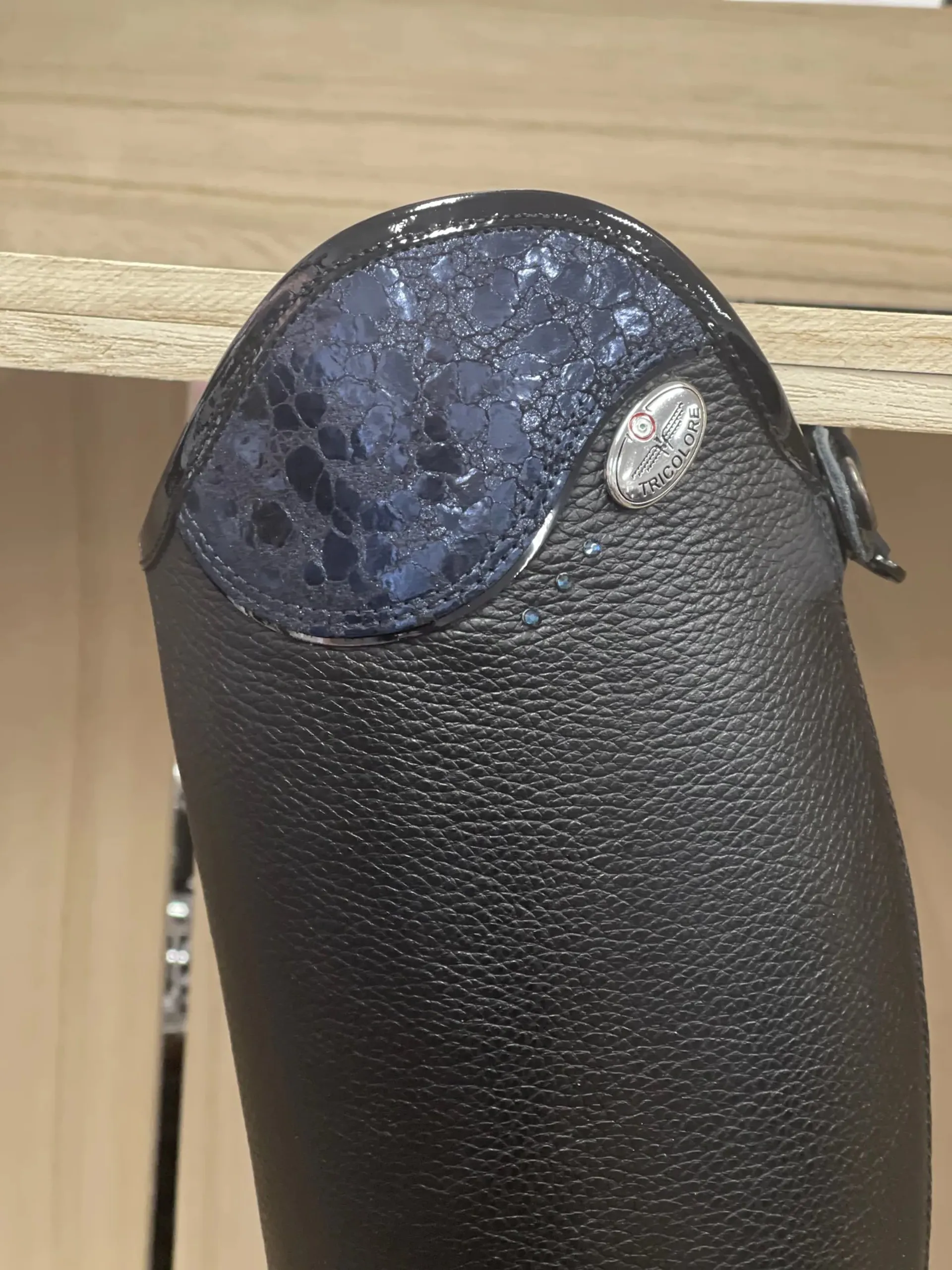 Question(s) answered about DeNiro Salentino/02 Riding Boot Laced Quick Black Leather Ice Navy Top