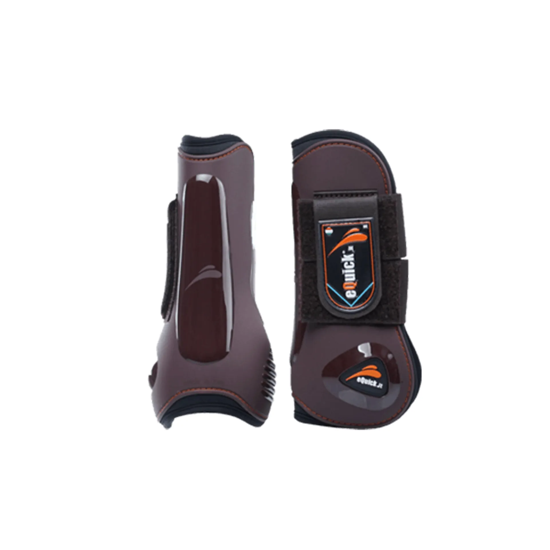 Open front tendon boots in neoprene coupled with Lycra, reinforced TPU shell with exclusive treatment that makes them looks like leather, equipped with two elastic straps and double velcro. Brown.