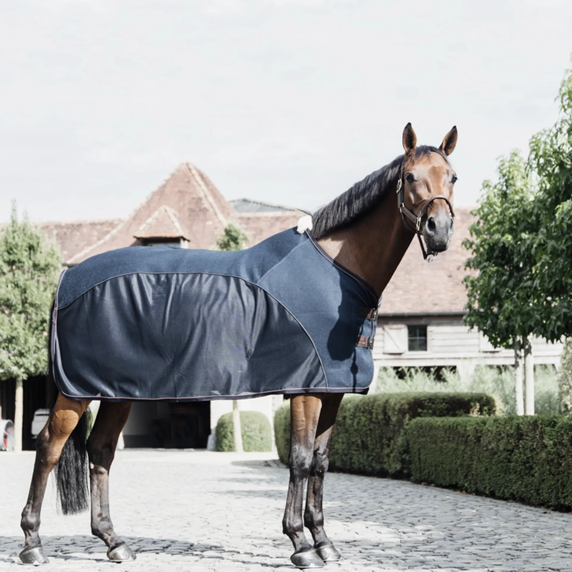 The rug is anatomically shaped at the back and has a flat-lined shoulder to make the rug fit nicely to the shape of the horse. For extra comfort, we added artificial sheepskin at the withers and removable surcingles. So, you can easily turn the rug into a showrug by removing the detachable surcingles. Additionally, we added our signature brown piping and the Kentucky logo in artificial leather for a luxurious look.