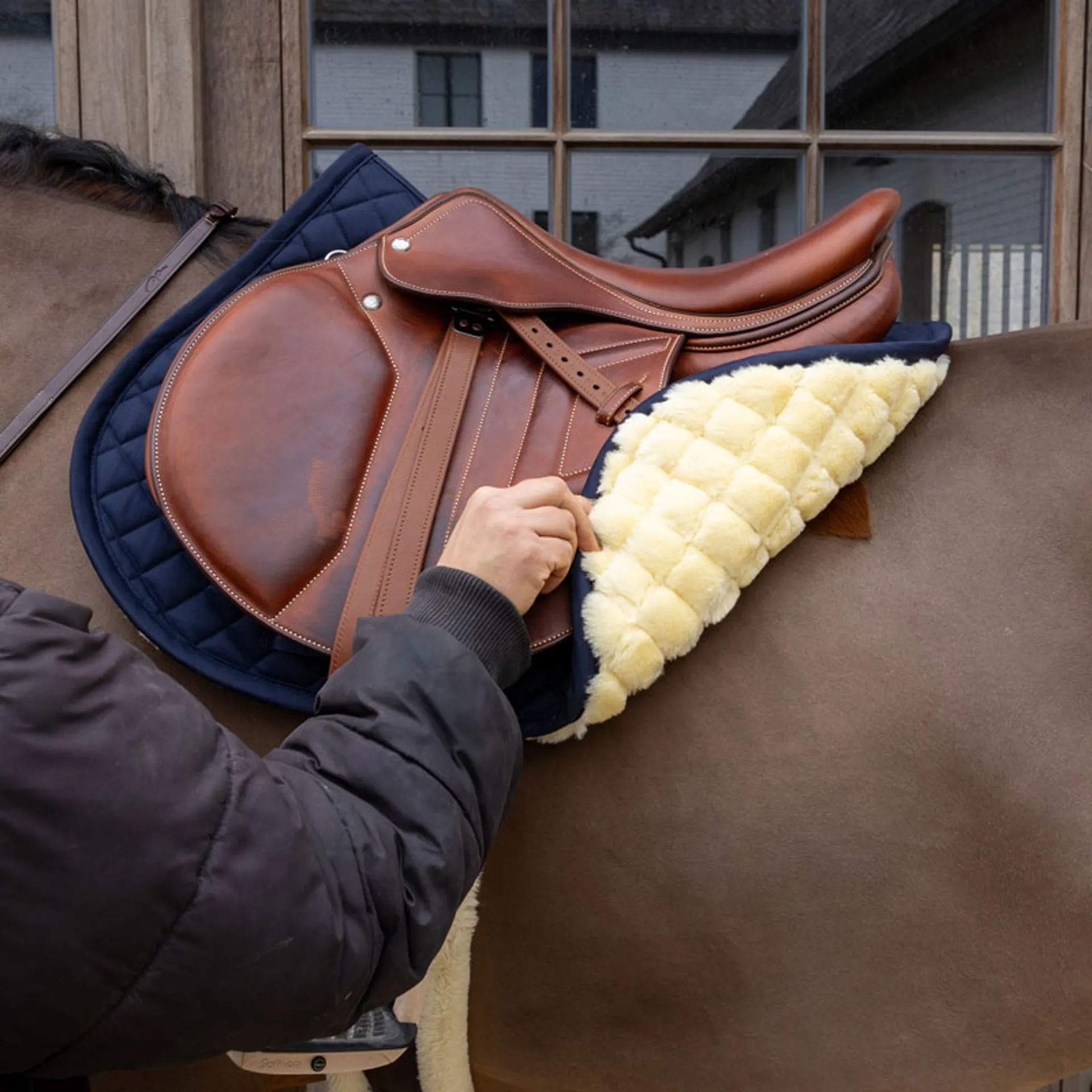 Question(s) answered about Kentucky Skin Friendly Saddle Pad Sheepskin Diamond Show Jumping - Navy