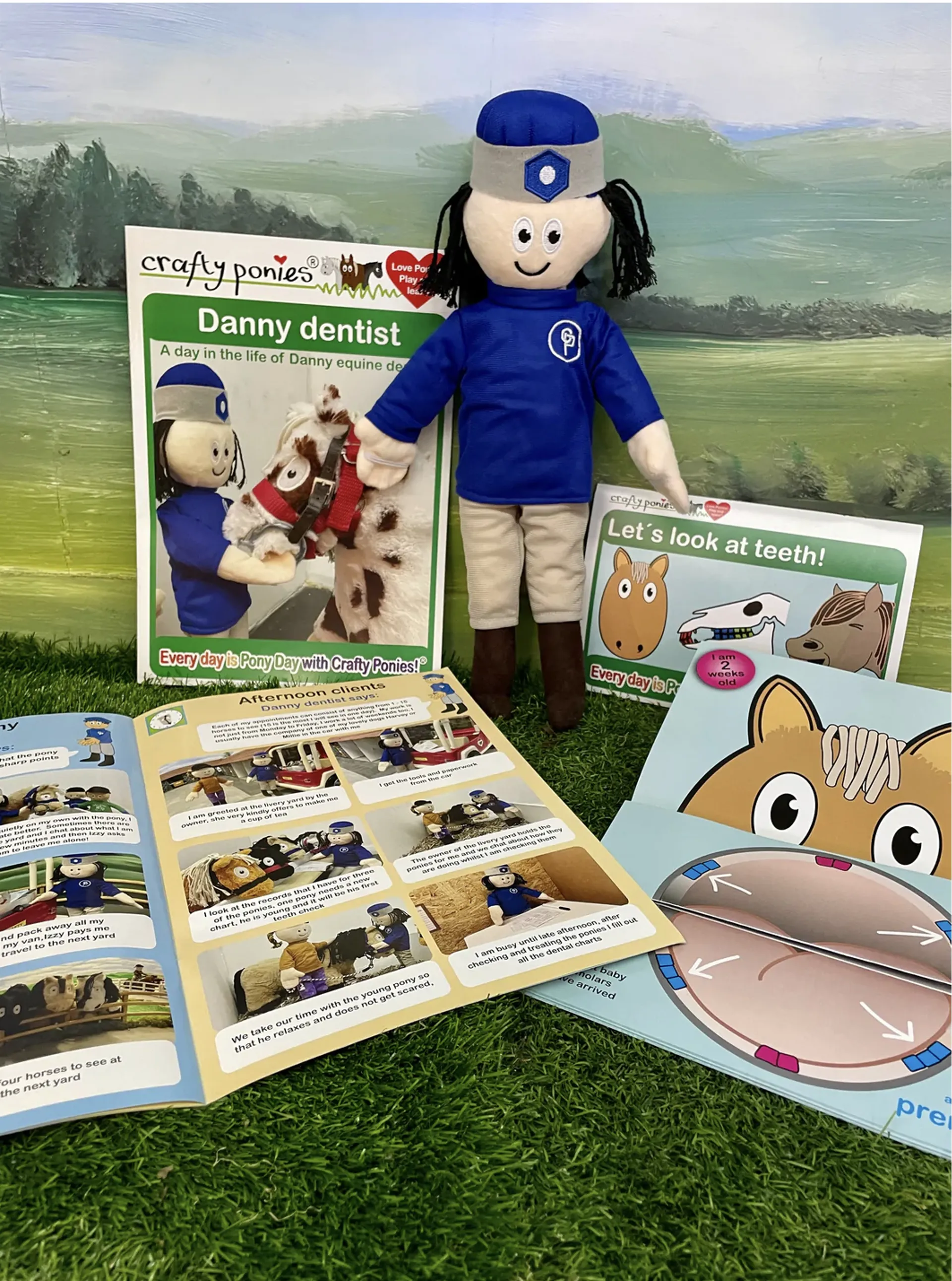 Danny the dentist doll comes with a fully illustrated 'A day in the life of Danny dentist' educational story book. Also included is an illustrated 'Teeth' booklet, this A5 booklet illustrates ponies teeth at different ages from foal to fully mature. It needs a few minutes of folding and sticking to make the 'pop-up' pages and then it's ready to help children to learn about ponies teeth in a fun new way!