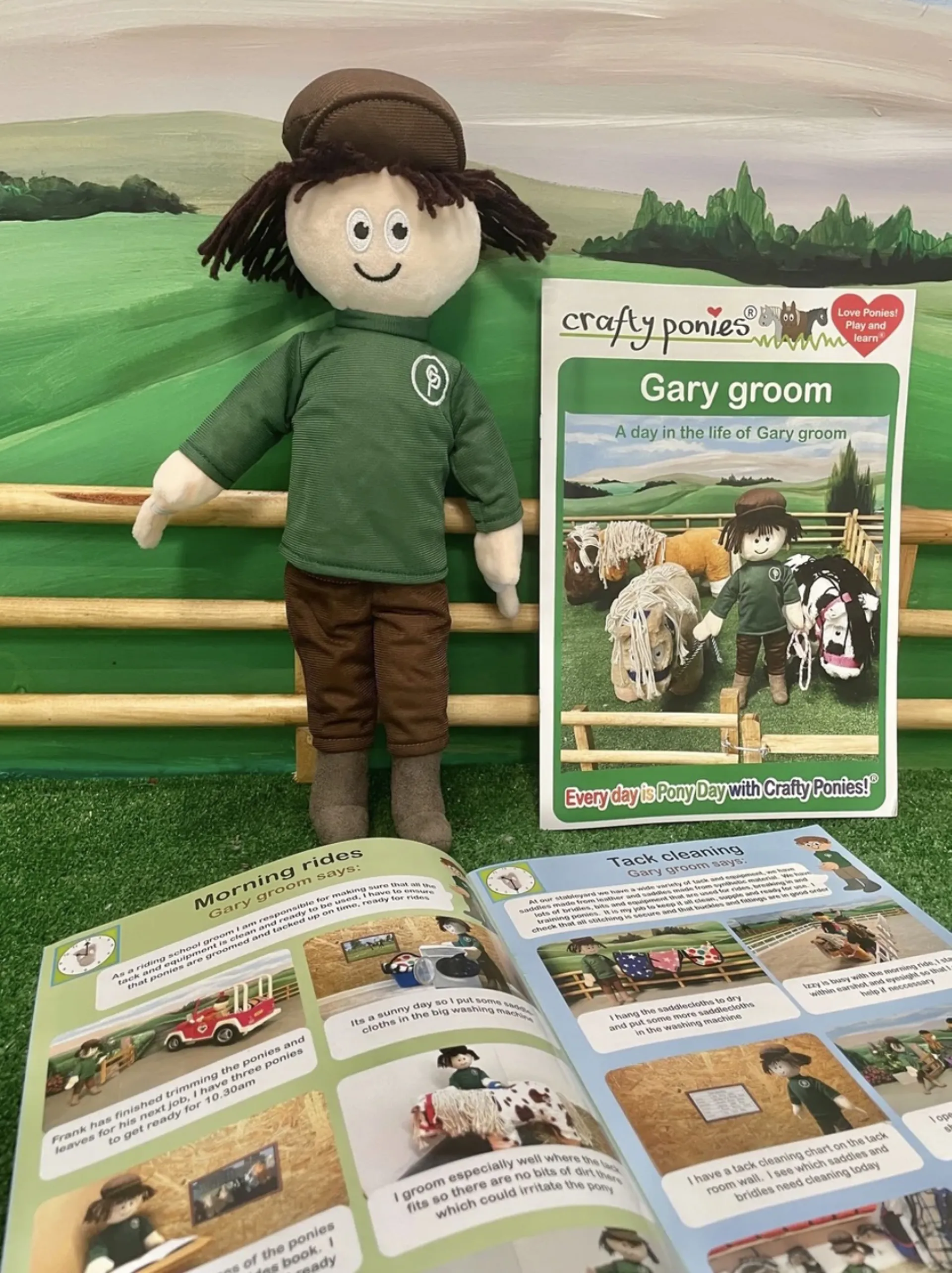 Gary groom is an important member of the Crafty Ponies family. Gary groom is a soft toy doll suitable for children of all ages, he comes with a fully illustrated A4 booklet taking children through a day in his life as a riding school groom.