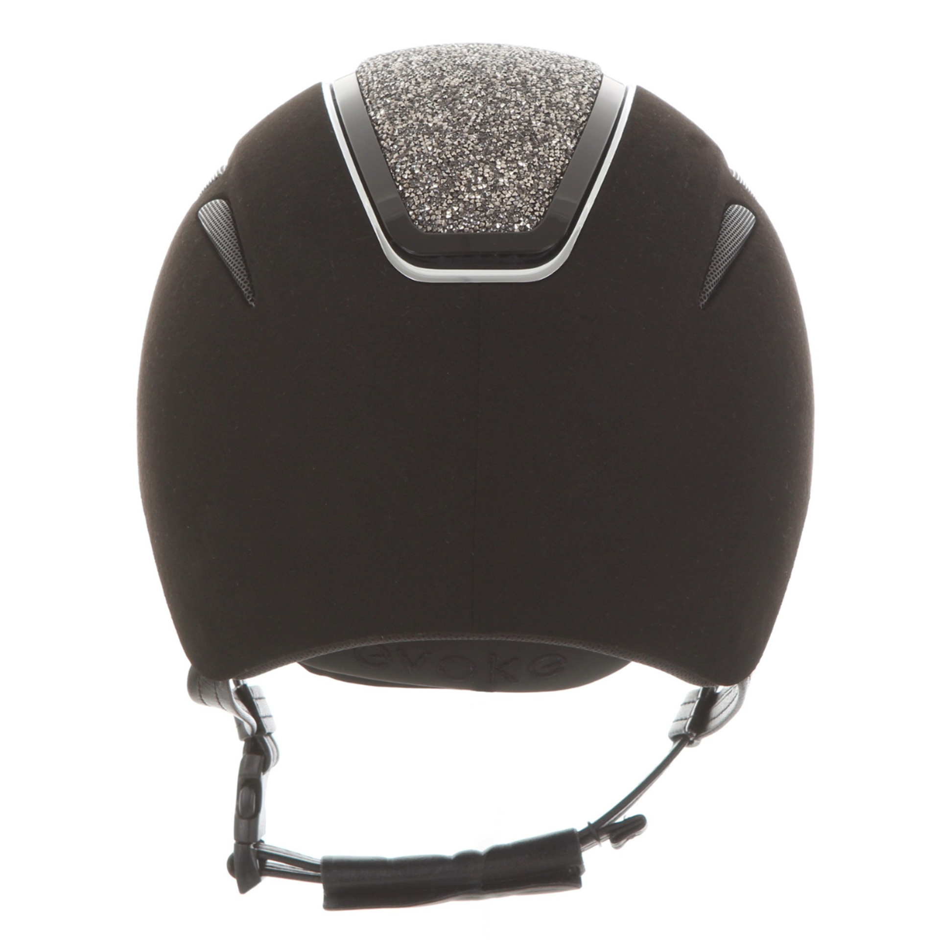 New for 2025, the Callisto Classic peaked riding helmet in a black suede finish with a sparkling silver marcasite crystal centre panel. Subtle black side vents are accompanied by black and chrome evoke branding.