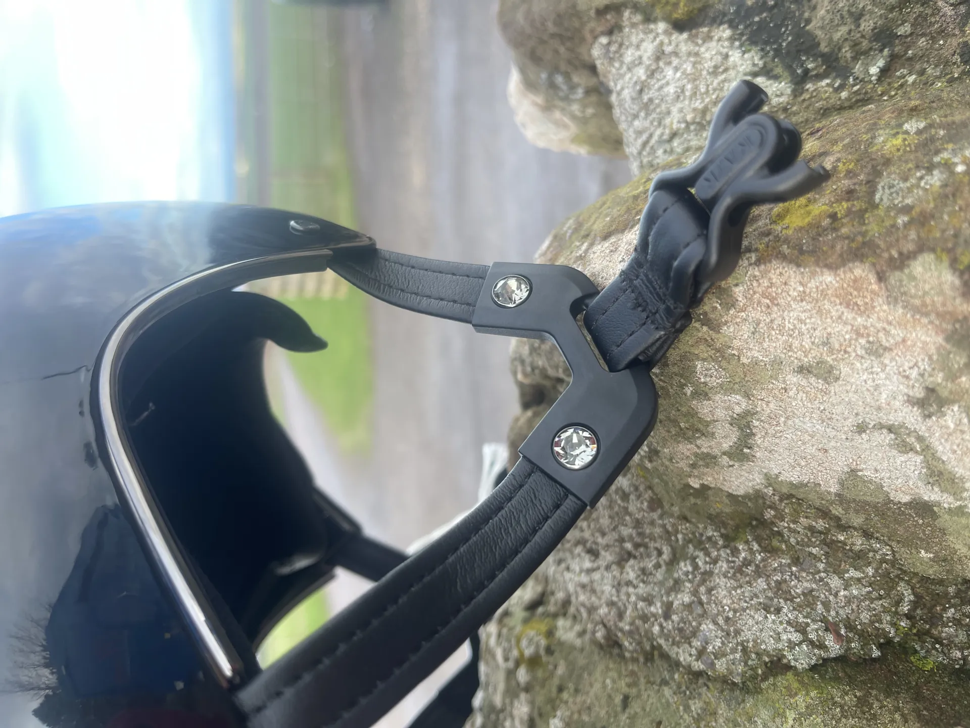• with 2 crystal stones per side on the chin strap