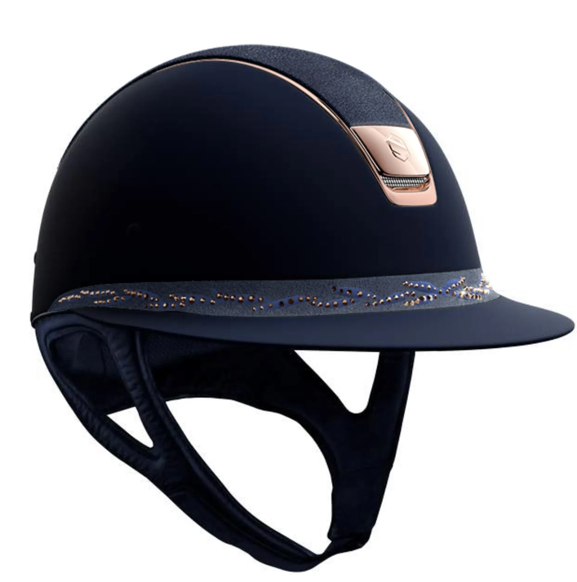 This beautiful design from Samshield is the Shadow Matt in Blue with Alcantara Top and Flower Swarovski Rose Gold Band, Rose Gold Trim + Blazon. Medium/Large Shell.